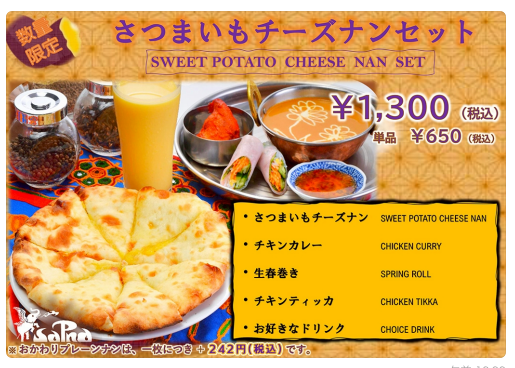 2026 0123 sapnaより さつまいも 🍠チーズ🧀ナンセット🫓 お得なセット \ 1300円 / ほんのり甘いさつまいも🍠と しょっぱ旨いチーズ🧀の 組み合わせが絶妙マッチ😍 冬の限定ランチ❄️ ほっこり温まってください🧤 Tweet Share Pin it ❄️年末年始は❄️サプナでパーティー🎉 前の記事