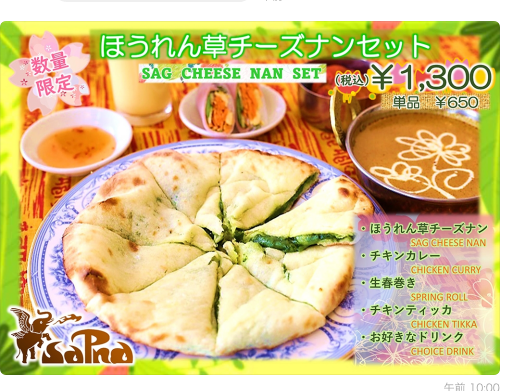 2026 0226 sapnaより 【数量限定✨3月1日~開始】🥬ほうれん草チーズ🧀ナン🥬 🥬ほうれん草チーズナン🥬 ***…***…***…*** ほうれん草の風味と 鮮やかな緑が春を感じます🌸 カレーとの相性もバッチリの 限定ナンです🧇🥘 ぜひご賞味ください🐘♪ Tweet Share Pin it さつまいも 🍠チーズ🧀ナンセット🫓 前の記事 LINEお友だち限定クーポン・ランチ100円引き 次の記事